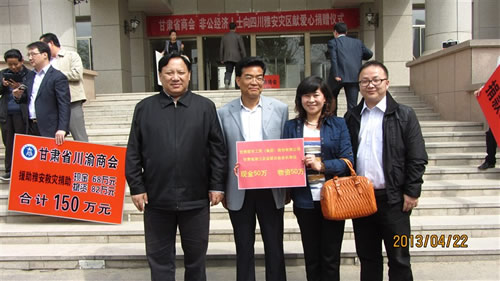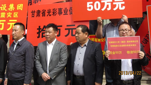 2013年4月22日下午15時,在甘肅省政協(xié)一樓,由甘肅省委常委、省委統(tǒng)戰(zhàn)部部長澤巴足,省委統(tǒng)戰(zhàn)部副部長、甘肅省工商聯(lián)黨組書記、第一副主席吳繼德等相關(guān)領(lǐng)導(dǎo)出席了“甘肅省商會非公經(jīng)濟(jì)人士向四川雅安災(zāi)區(qū)獻(xiàn)愛心捐贈儀式”。捐贈現(xiàn)場眾多甘肅省非公企業(yè)向4月20日雅安市地震災(zāi)區(qū)進(jìn)行了捐贈,廣大愛心企業(yè)和人士用自己的實(shí)際行動對災(zāi)區(qū)同胞奉獻(xiàn)了自己的真情和祝福。