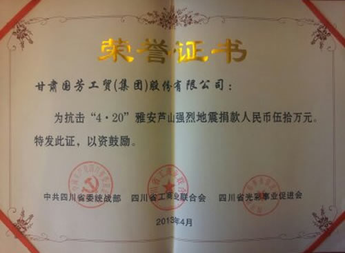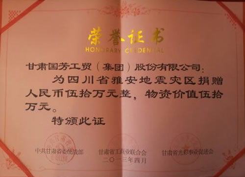 北京時間2013年4月20日8時02分,四川省雅安市蘆山縣發(fā)生7.0級大地震,作為甘肅省知名企業(yè)以及“甘肅省十大慈善單位”,國芳集團(tuán)在第一時間向?yàn)?zāi)區(qū)捐贈50萬元現(xiàn)金和50萬元的物資,向?yàn)?zāi)區(qū)群眾送去一份愛心,這一善舉得到了廣大社會輿論的好評和百姓的良好口碑,并得到了四川、甘肅兩省,省委統(tǒng)戰(zhàn)部、省工商聯(lián)、省光彩事業(yè)促進(jìn)會的表揚(yáng)和嘉獎。在此國芳集團(tuán)呼吁更多的企業(yè)能夠加入社會公益、慈善的行列里來,讓社會主義大家庭的溫暖,灑向神州大地,也祝愿雅安同胞早日遠(yuǎn)離苦難,重建家園。