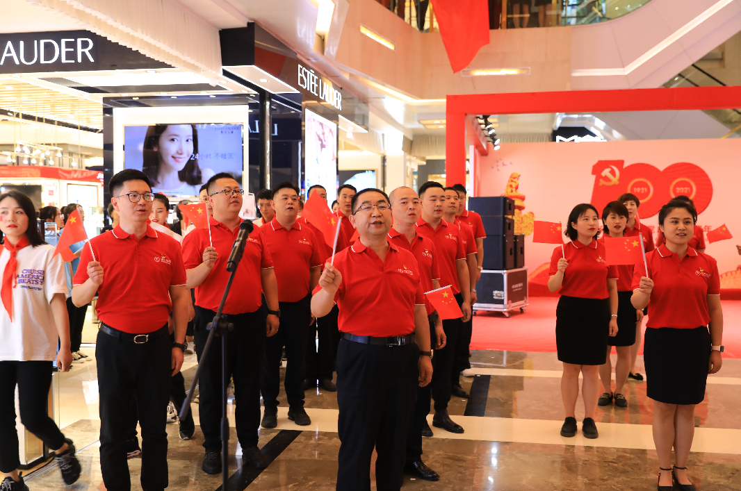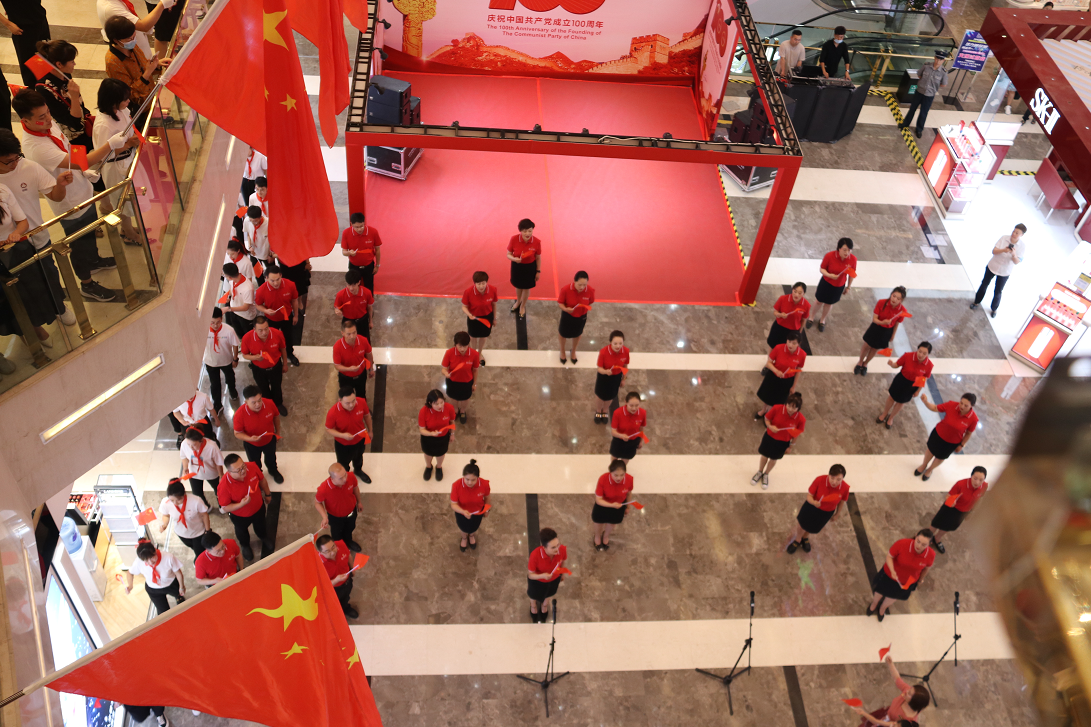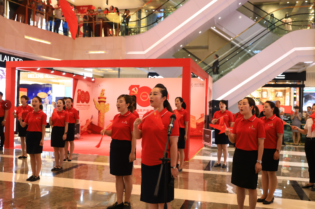 下午14時,國芳集團(tuán)慶祝中國共產(chǎn)黨成立100周年紅歌快閃活動在蘭州國芳百貨廣場店一樓中廳隆重舉行。國芳集團(tuán)全體黨員及員工代表參與其中,大家用歌聲表達(dá)對黨的無限忠誠和美好祝福。